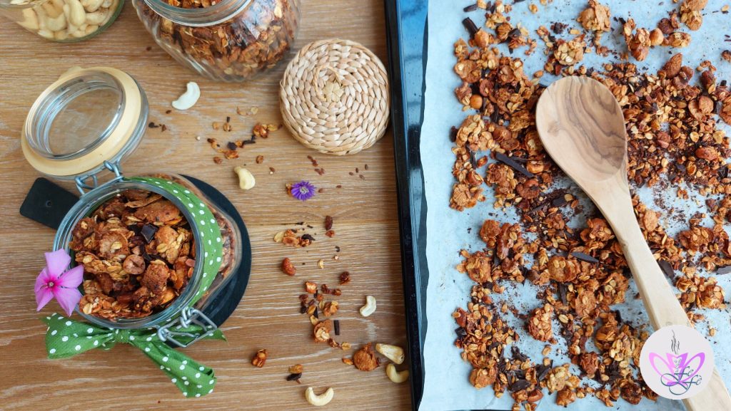 Je kunt de combinatie van granen, noten en zaden kiezen die je verkiest. Als het eenmaal klaar is, kun je naast de chocolade de granola verder verrijken met gedroogd fruit naar keuze zoals dadels of gedroogde abrikozen, maar houd er rekening mee dat als je een strikt dieet volgt, dit zal resulteren in een hogere inname van suikers en calorieën.