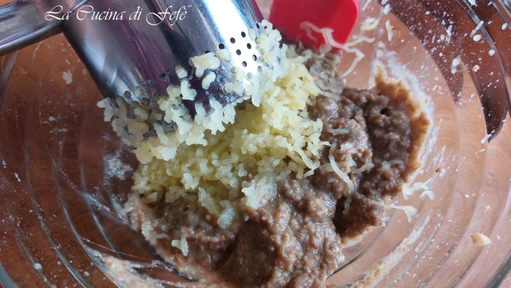 • Je moet een pasta-achtig en homogeen mengsel verkrijgen, voeg dan de nog warme gekookte aardappel toe, geplet met een pureestamper.