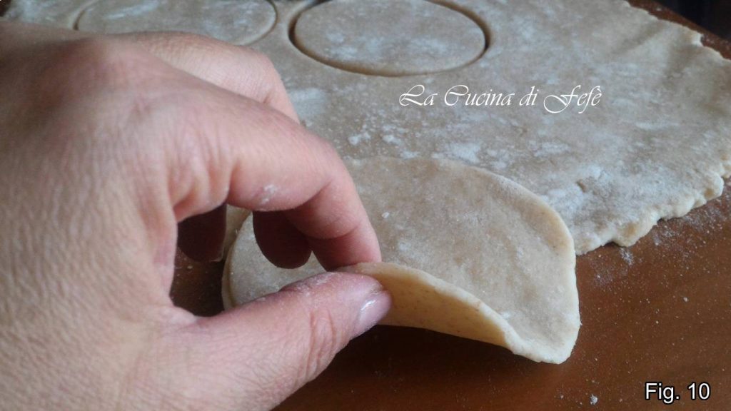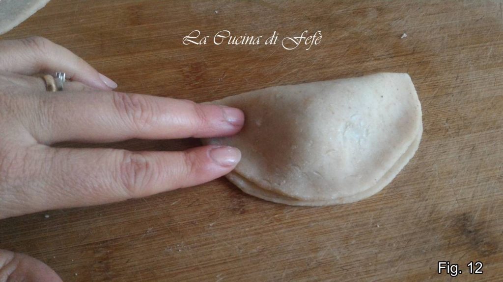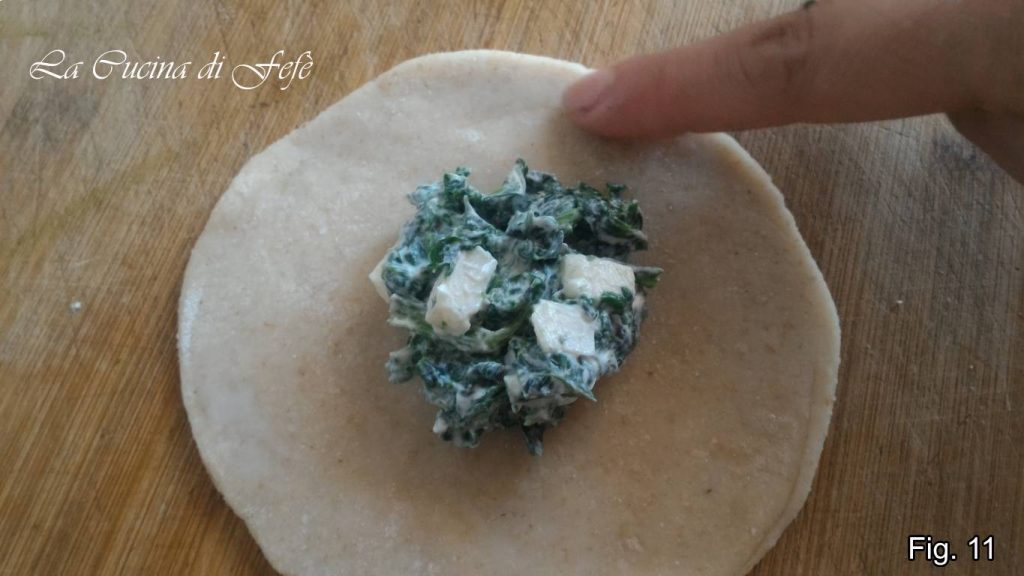 Mix de goed uitgelekte spinazie met de in blokjes gesneden robiola en asiago, vul vervolgens elke deegcirkel met een theelepel van dit mengsel en bestrijk de randen licht met wat melk (fig. 11).