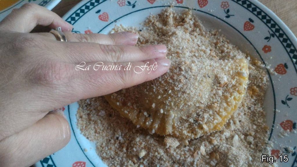Haal de sofficini eerst door een geklopt ei met een beetje melk en een snufje zout (fig. 14).