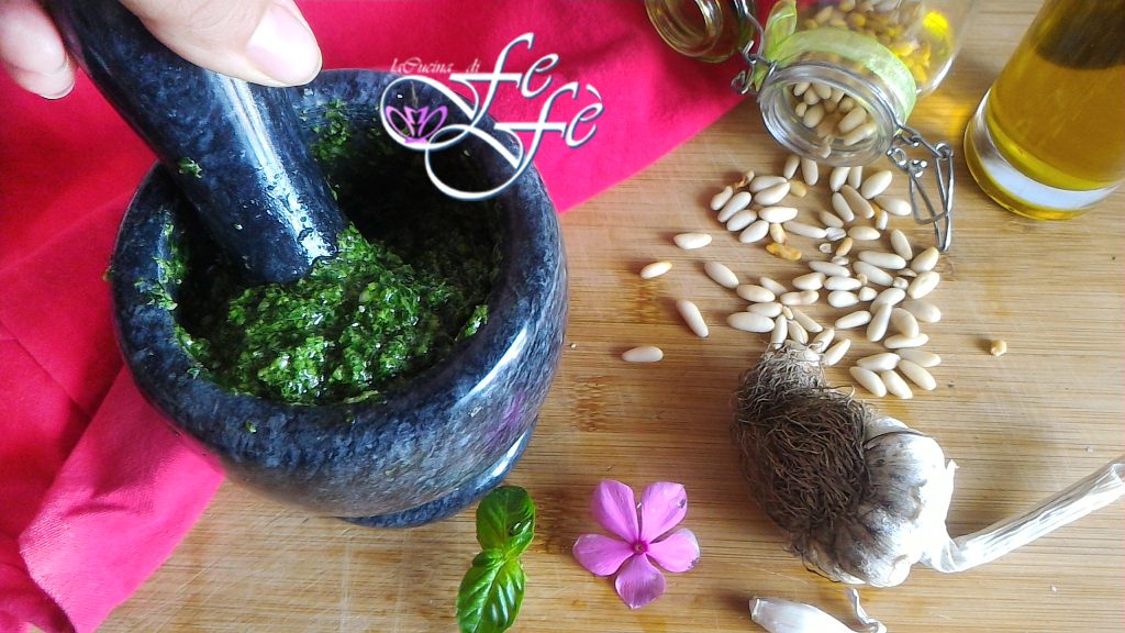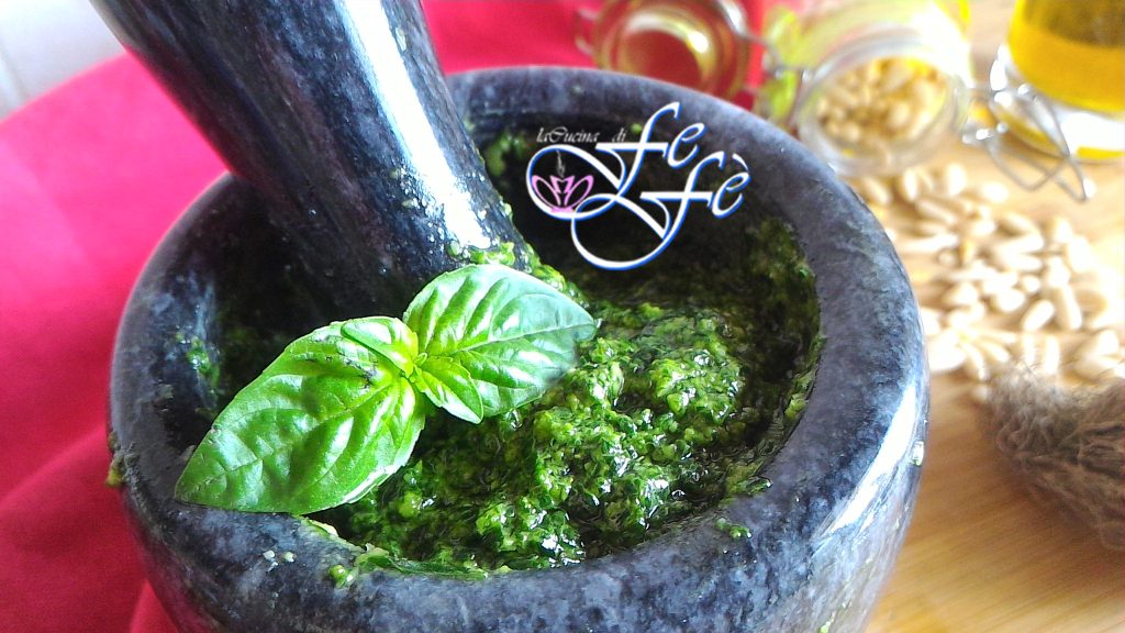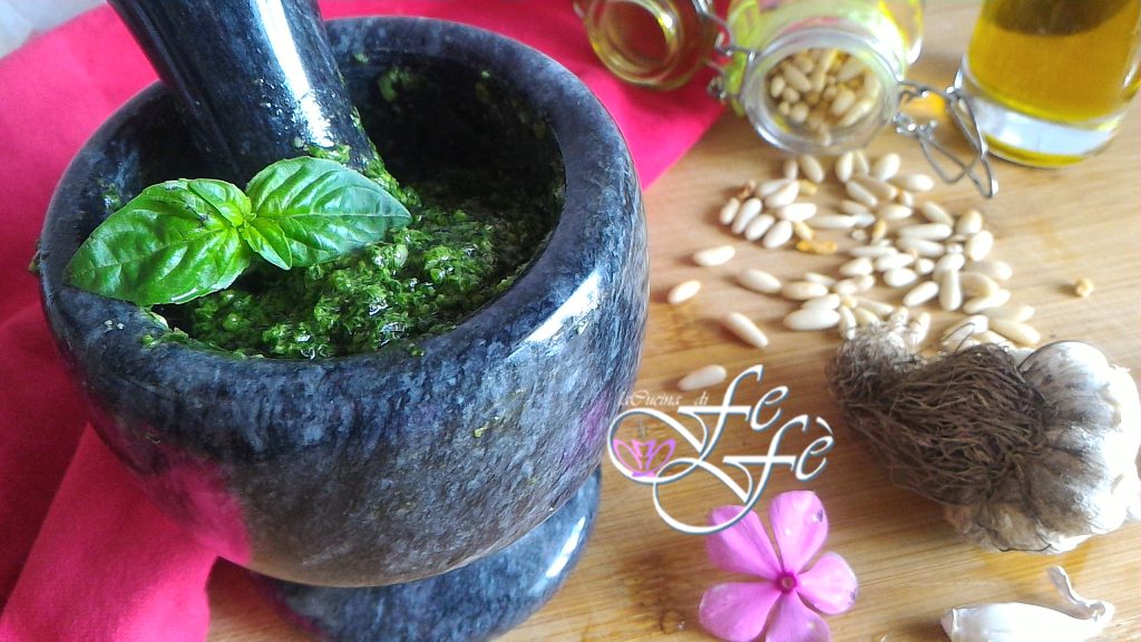 De basilicumpesto is een typische saus uit de traditionele Ligurische keuken, bereid tijdens het lente- en zomerseizoen om vervolgens op onze tafels te verschijnen als wintervoorraad. De pesto kan zo worden gebruikt om pasta op smaak te brengen, vlees, maar ook hartige taarten, groenten en nog veel meer! Misschien lijkt het voor u voor de hand liggend om het proces voor het maken van een goede basilicumpesto voor te stellen, maar zelfs de ogenschijnlijk eenvoudige dingen kunnen valkuilen hebben als ze niet volgens de juiste methode worden uitgevoerd! Allereerst is het aan te raden om alleen de gezondste en meest verse bladeren te kiezen, terwijl de vergeelde en oude bladeren worden weggegooid. De smaak van knoflook mag absoluut niet de andere ingrediënten overheersen, daarom is het belangrijk om het goed te doseren en de in het recept vermelde hoeveelheden niet te overschrijden. De keuze van de kazen is even belangrijk! Het echte recept voor Genovese pesto vereist pecorino en Parmezaanse kaas. De pijnboompitten zijn strikt Italiaans, maar in mijn variant vindt u ook Siciliaanse pistachenoten, die absoluut optioneel zijn, maar die er erg goed bij passen. Bovendien wordt vaak gezegd dat voor het bereiden van een goede pesto een vijzel met een marmeren stamper nodig is volgens een traditionele manier van gebruiken. Echter, bij gebrek hieraan is de snelste, meest praktische en meest gebruikelijke optie zeker de blender of mixer. Wat de methode ook is, volgens mij komt het erop aan ingrediënten van de hoogste kwaliteit te gebruiken en ze perfect te combineren! Alleen dan kunt u genieten van een sublieme pesto die perfect samengaat met elk gerecht dat u maar wilt!