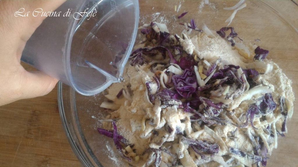 • Voeg twee snufjes zout toe, de peper, het eerder gezeefde kikkererwtenmeel en giet het water er geleidelijk bij.