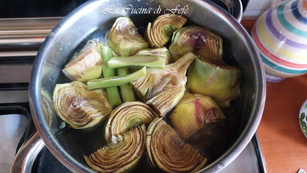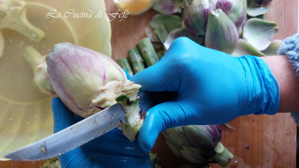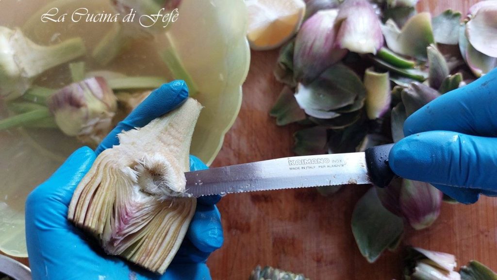 Het schoonmaken: na het grondig schoonmaken van de artisjokken en het verwijderen van de taaiste bladeren (ja, het is vervelend maar noodzakelijk!), halveer je de harten en dompel ze in gezuurde water.