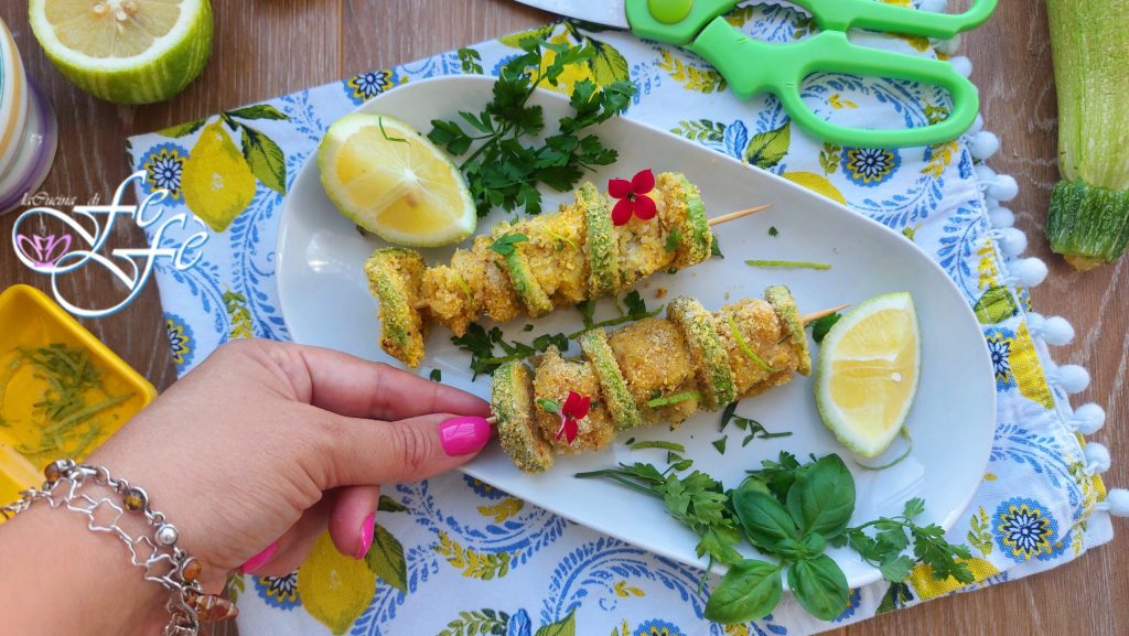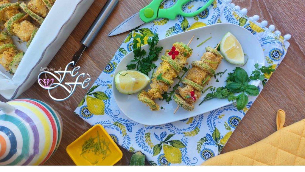Voor dit recept heb ik me laten inspireren door een food creator die ik toevallig op sociale media tegenkwam! Ik zocht er niet specifiek naar, maar het wist zeker meteen mijn aandacht te trekken vanwege de eenvoud van de ingrediënten en de uitvoering! Bovendien leek het mij echt spectaculair om ook aan een informele lunch of diner met vrienden voor te stellen, dus probeerde ik het te repliceren, maar niet trouw! Jullie kennen me inmiddels, ik hou er altijd van om hier en daar mijn persoonlijke toevoegingen te doen die, denk ik, specifiek aan dit gerecht dat beetje extra hebben gegeven dat zeker niet misstaat! Er zijn twee hoofd- en onbetwiste ingrediënten voor het bereiden van dit recept: de eerste is kabeljauw, een vis die geschikt is voor iedereen, omdat hij lekker, gezond en gemakkelijk verkrijgbaar is, en daarom ook in kant-en-klare stukken verkrijgbaar is. Uiteraard is elke andere vissoort zoals zalm of heek, die qua zachtheid en textuur erg op elkaar lijken, ook prima. Het tweede ingrediënt is de courgette, een zeer veelzijdige seizoensgroente die goed past bij elke bereiding. Een perfecte combinatie die nog lekkerder wordt gemaakt door een aromatische en citrusachtige paneerlaag die alle smaakpapillen zal veroveren, zelfs de meest veeleisende! U kunt deze spiesjes ook heel gemakkelijk bereiden als fingerfood tijdens een buffet of als perfect hoofdgerecht, ook voor uw kinderen om vis op een leuke manier te laten eten.