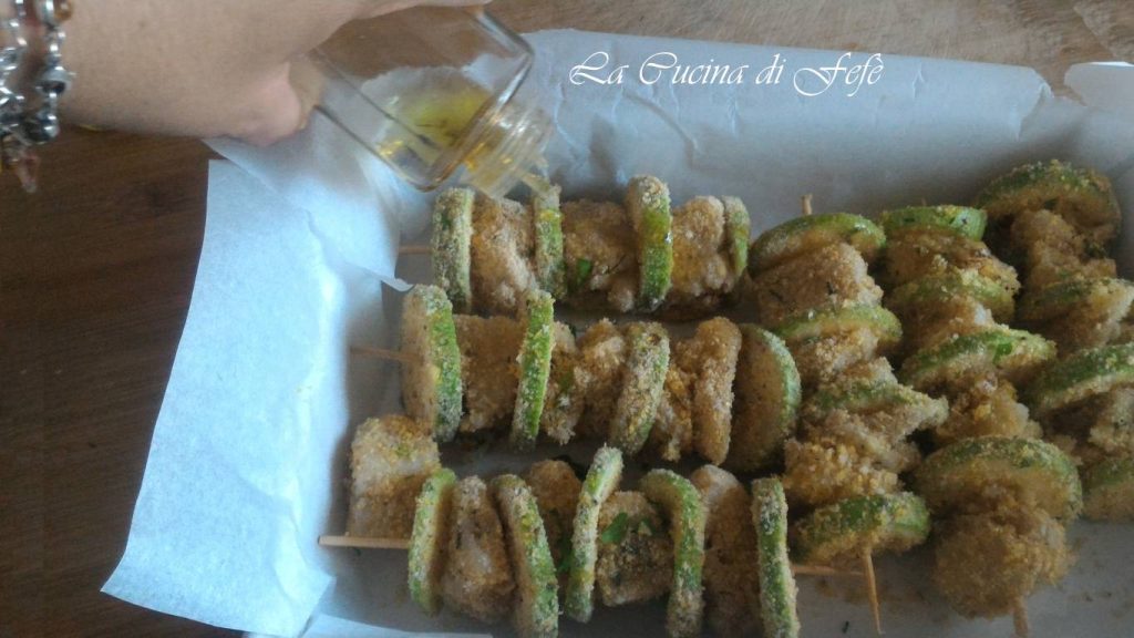 • Leg alle spiesjes, er komen er ongeveer 6-7 uit, op een bakplaat bekleed met bakpapier. Besprenkel ze met een beetje olie en bak ze in een voorverwarmde oven op 180°C gedurende 30-35’.