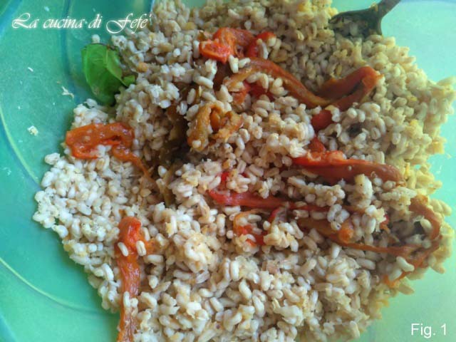 Kook ondertussen de kamut in een pan met ruim gezouten water en, vanaf het moment dat het kookt, kook het gedurende 25’/30′ of volgens de tijden op uw verpakking. Voeg de laatste 15′ ook de linzen toe en kook verder. Als de kamut gaar is, giet je het af, laat je het afkoelen en doe je het in een ruime slakom. Voeg de helft van de pesto en de paprikareepjes toe (fig. 2).