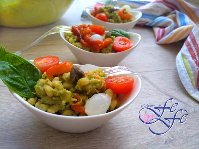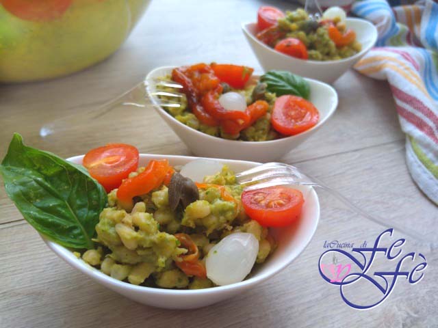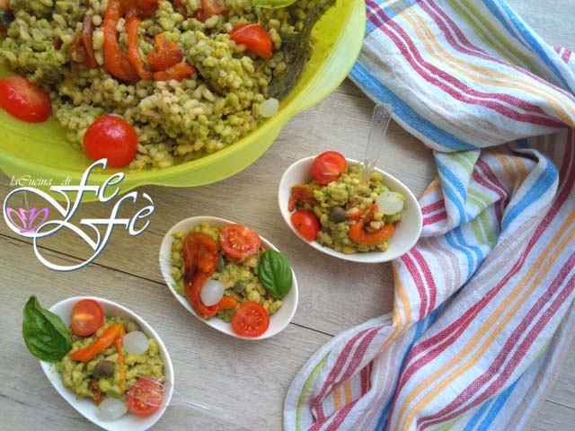 Ik abonneer me nu op koelkastopruimrecepten, die de beste manier zijn om steeds onaanvaardbaardere voedselverspilling te voorkomen en zo ook te besparen op de dagelijkse boodschappen! Gezien het feit dat hier in Catania de herfst alleen in naam bestaat omdat de luchtvochtigheid met bijbehorende hitte ver boven de seizoensgemiddelden ligt, heb ik gebruikgemaakt van wat ik in de koelkast had voordat ik opnieuw boodschappen ging doen. Zo bracht ik een aangenaam fris gerecht op tafel, compleet vanuit eiwitperspectief en tegelijkertijd smaakvol! Ik moet zeggen dat mijn grootste tevredenheid kwam bij het medisch onderzoek van mijn man, die, kijkend naar de resultaten van zijn analyses, complimenteerde met deze woorden: “Je kunt zien dat je man goed eet”! Nou, wat kan ik zeggen? Ik was erg trots op mijn werk en op het feit dat, als de persoon van wie ik hou zich beter voelt, ik daar in zeer kleine mate aan heb bijgedragen! Maar genoeg met de sentimentaliteit, en laten we overgaan tot mijn voorstel van vandaag, dat supergezond is en ook geschikt voor mensen die een veganistisch dieet volgen, omdat het geen dierlijke ingrediënten bevat. Het is een salade op basis van kamut, gekruid met een geweldige rucola- en avocadopesto, beide dringend op te maken en, ik zweer het, het doet de doden herrijzen. Ik voegde wat gegrilde paprikareepjes toe, rode linzen, die ook op moesten vanwege de naderende vervaldatum, maar die zorgden ervoor dat ik nooit een goede dosis peulvruchten miste, en daarmee vitamines en mineralen in overvloed. Het zal perfect zijn als een eenpansgerecht of, zoals ik deed, als een decoratieve fingerfood of een informele aperitiefmaaltijd met vrienden! In enkele eenvoudige woorden, een overvloed aan welzijn, smaak en kwaliteit in één enkel recept!