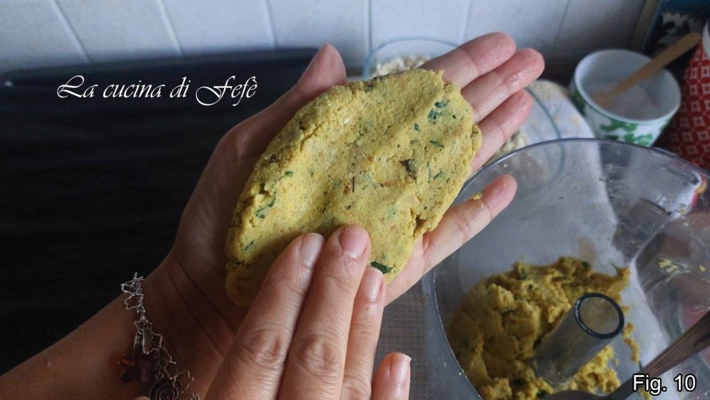 Druk ze lichtjes plat en haal ze aan beide zijden door het eerder bereide mengsel van dubbel paneermeel (fig. 11). Leg de kikkererwt koteletten op een met bakpapier beklede bakplaat, besprenkel de bovenkant met een beetje olie en bak ze in een voorverwarmde oven op 180°C gedurende 25′-30′, draai ze een paar minuten voordat je de oven uitzet (fig. 12).