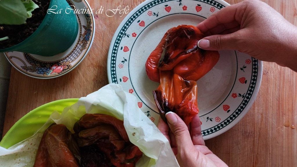 Zodra ze gekookt zijn en hebben gerust in een papieren zak, zal de dunne schil van de paprika’s waarmee ze bedekt zijn heel gemakkelijk loskomen met de handen.