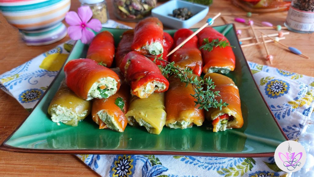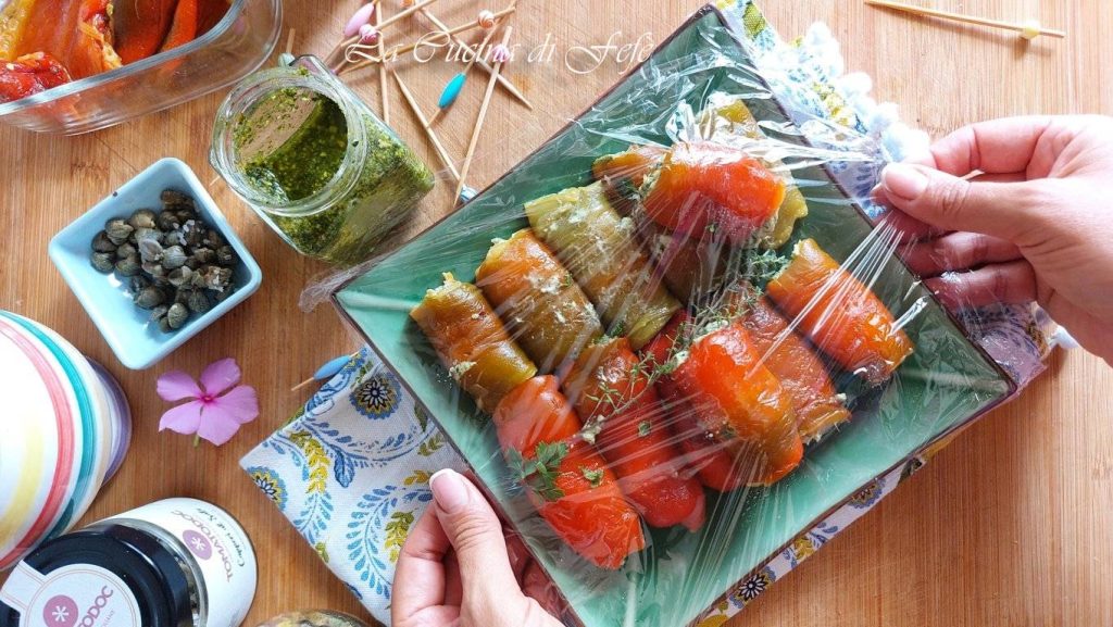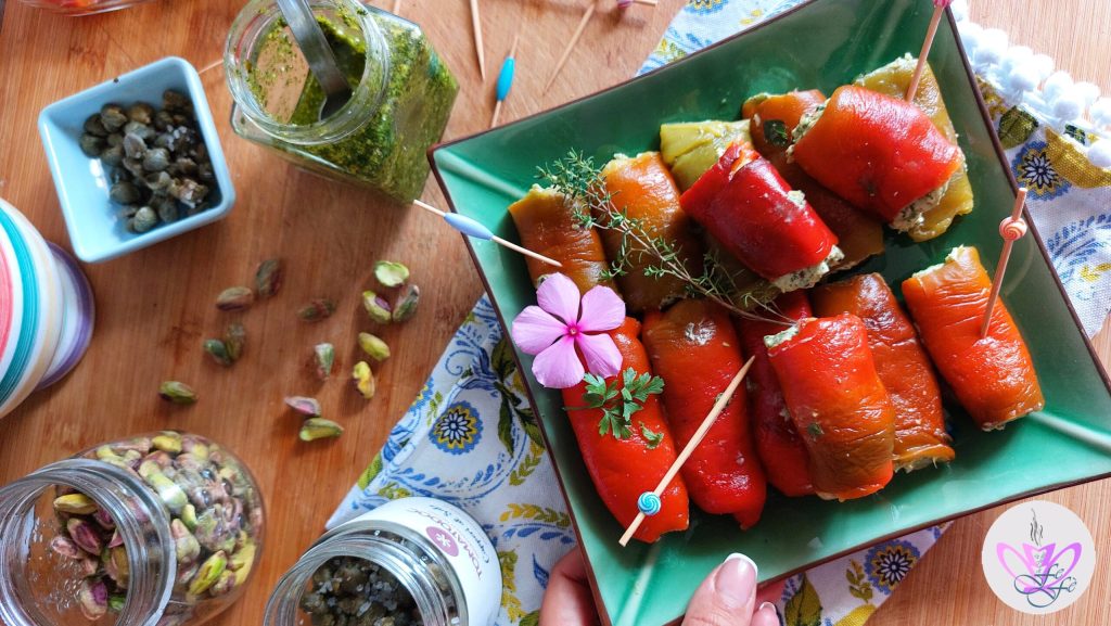 Heb je smeerkaas die op moet of pesto over van de lunch van de dag ervoor, of zelfs, zoals ik, beide? Hier is hoe je een voorgerecht kunt maken dat ronduit verrukkelijk is, beginnend met ingrediënten die we allemaal in de voorraadkast of koelkast hebben! Je hebt maar een paar eenvoudige stappen nodig en geen gedoe, alleen het aanvankelijke aanzetten van de oven om de paprika’s te bakken, tenzij je, net als ik, vooruit bent gelopen en ze al in de koelkast hebt bewaard, klaar voor gebruik! Het is namelijk gemakkelijk dat ik al wat gekookte en schoongemaakte groenten in de koelkast heb liggen, omdat ik van organiseren houd, en dat heeft me nooit problemen opgeleverd! Dus, toen ik gisterenavond laat thuiskwam van een aantal klusjes, trok ik mijn schort aan en binnen een half uur was alles klaar! Een sprookje! Je kunt je niet voorstellen hoe lekker deze rolletjes zijn! Om opnieuw te maken voordat het seizoen voorbij is! Ze zijn ook echt heerlijk als een vegetarisch hoofdgerecht, maar ze zijn vooral geschikt als smakelijke fingerfood bij de opening van een informele lunch of diner met vrienden! En in de zomer, als het warm is, worden ze koud geserveerd en zijn ze heel geliefd!