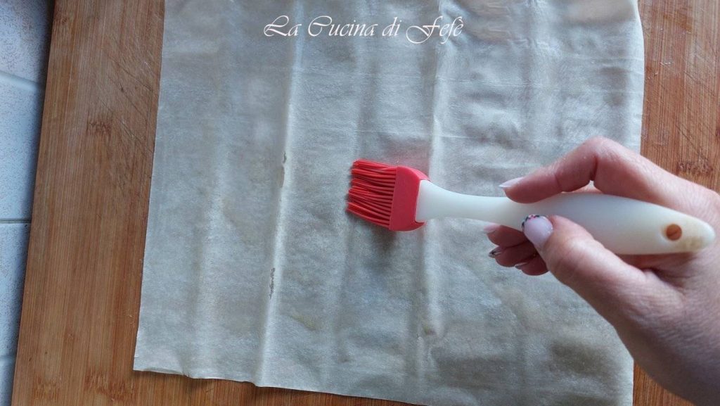 Bestrijk het eerste vel filodeeg met een mengsel van water en olie (verhouding 5:3) en leg er een ander vel filodeeg bovenop. Bestrijk ook dit vel met het olie en water mengsel.