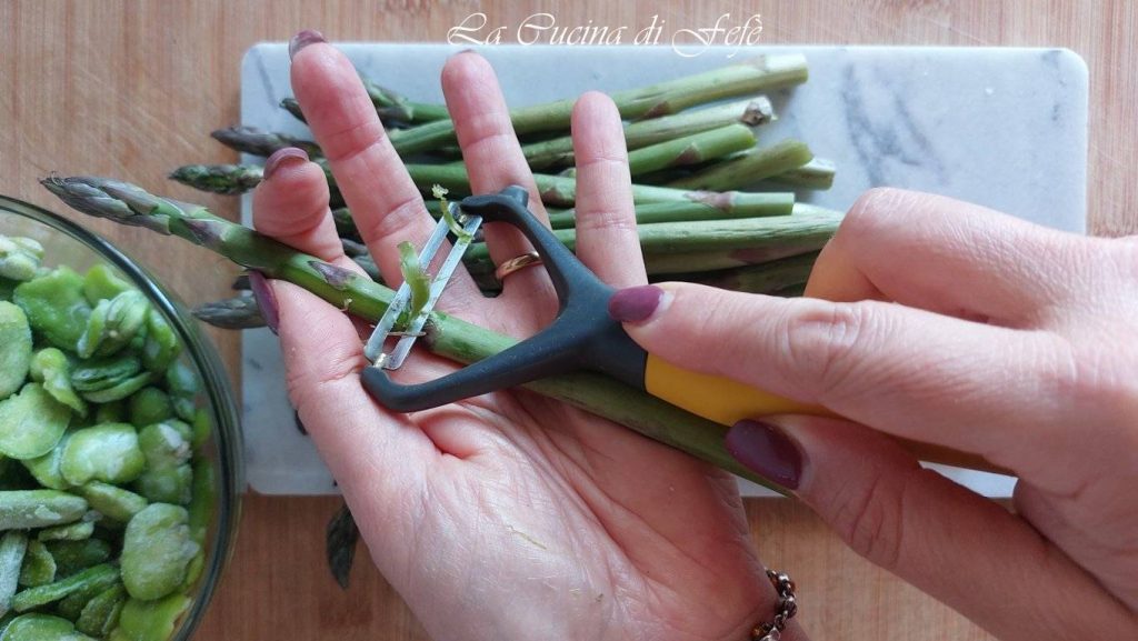 Schil de asperges met een dunschiller of voorzichtig met een klein mes, werk verticaal van boven naar beneden totdat de stam vrij is van vezelige groene draadjes. Wilde asperges zijn zeer teder en dun en hoeven meestal niet geschild te worden.