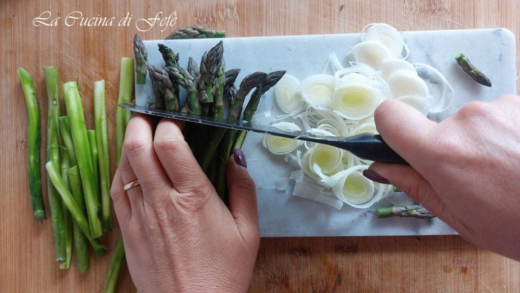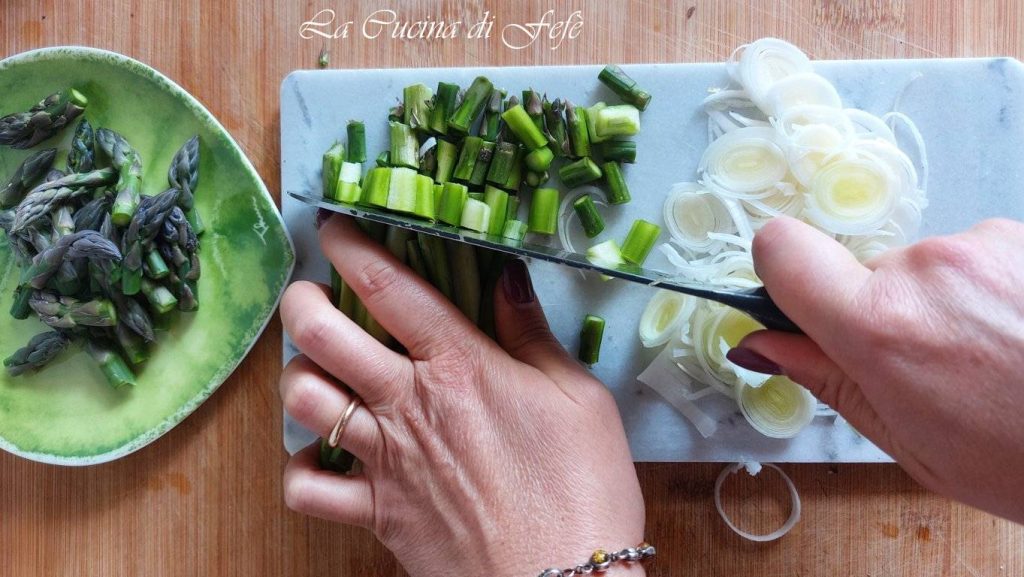 🔵**Er bestaan veel soorten asperges: sommige zijn groen met een witte steel, andere zijn volledig wit (de variëteit die zonder zonlicht onder de grond groeit blijft wit) of paars (de beroemde asperges uit Albenga). Daarom is voor het verwijderen van het uiteinde, het taaiste deel dat niet meegekookt hoeft te worden, het niet voldoende om alleen naar de kleur van de steel te kijken; zo verwijder je het niet te veel of te weinig.