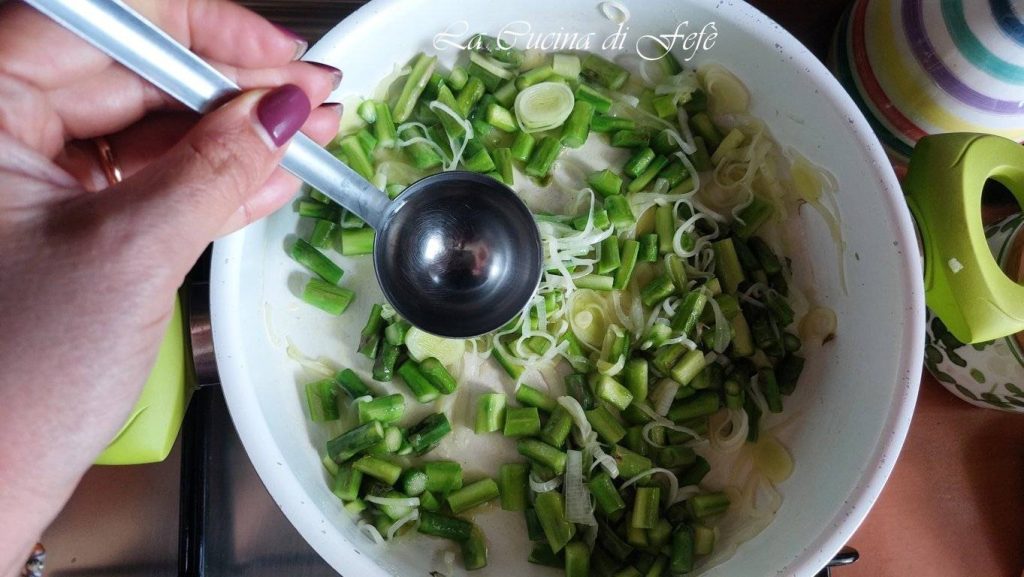 Voeg ook de aspergestengels toe en laat 5 minuten meebakken op een lager vuur zodat ze goed op smaak komen.