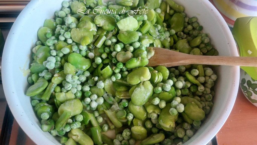 Voeg vervolgens de al gedopte erwten en tuinbonen zonder vliesje toe en laat zachtjes ongeveer 10 minuten koken met de deksel op de pan en voeg extra bouillon toe alleen indien nodig.