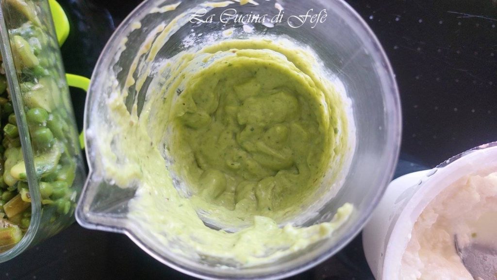 Zeven de ricotta met behulp van een zeef, doe hem in de maatbeker van een staafmixer samen met 2-3 eetlepels van het zojuist bereide en inmiddels lauwe mengsel.
