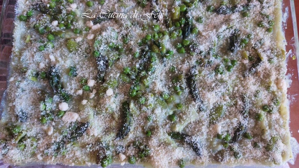 Voeg een paar klontjes boter toe op het oppervlak en nog wat geraspte pecorino en Parmezaan. Als de béchamel te dik is, kun je een paar lepels bouillon in de hoeken van de schaal gieten: dit voorkomt dat de lasagne te droog wordt tijdens het bakken. Bedek daarna met bakpapier en bak in een voorverwarmde oven op 180°C gedurende 20 minuten, verwijder dan het bakpapier en zet de oven nog 10 minuten aan of totdat het oppervlak van de lente-lasagne licht goudbruin is.