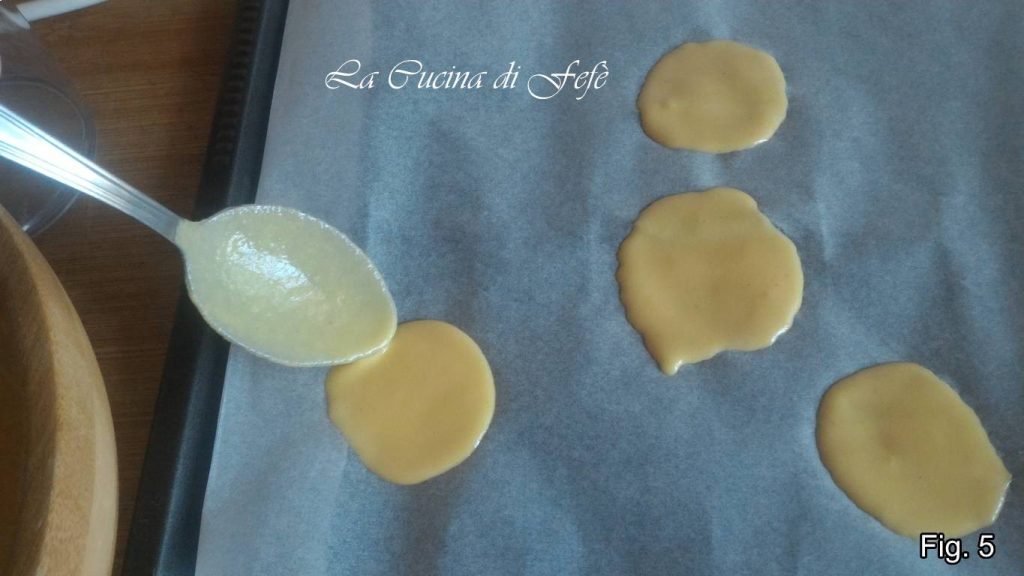 Op dit punt verdeel je iets minder dan 1/2 eetlepel beslag per keer op een met bakpapier beklede bakplaat, waardoor zeer dunne schijven ontstaan. Hoe dunner ze zijn, hoe krokanter ze aan het einde van het bakken zullen zijn en lijken op chips (fig. 5).