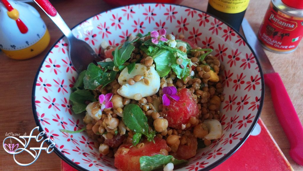 Zomer betekent voor mij frisse, snelle en lichte gerechten! Ik hou er niet van om te lang in de keuken te staan, maar breng liever mijn tijd buiten door, aan zee, reizen en minder calorierijke en eenvoudigere maaltijden eten! Deze salade weerspiegelt precies deze prioriteiten, sterker nog, ik zou het meer een hoofdgerecht dan een bijgerecht noemen, gezien het feit dat je binnenin alle waardevolle plantaardige eiwitten van peulvruchten vindt, in dit geval kikkererwten en linzen. Alles is snel klaar te maken, als je de voorgeschilde peulvruchten koopt, hoef je alleen maar de ingrediënten in een slakom te mengen en op smaak te brengen. Ik zeg je, te lekker! Voor degenen die een lichte maar voedzame maaltijd willen, hier zijn alle gezondheidsvoordelen van een vegetarisch gerecht, met een hoog energetisch vermogen! De keuze van de dressing speelt hier de hoofdrol, want de extra vergine olijfolie met citroen die ik heb gebruikt, is in tegenstelling tot andere gearomatiseerde oliën op de markt, gemaakt van “echte” citrusvruchten, samen met de olijven geperst. Een grote Siciliaanse trots die ik graag deel en laat kennen, in staat om alle aanwezige ingrediënten te verbeteren en een ongelooflijke frisheid aan elke hap te geven!