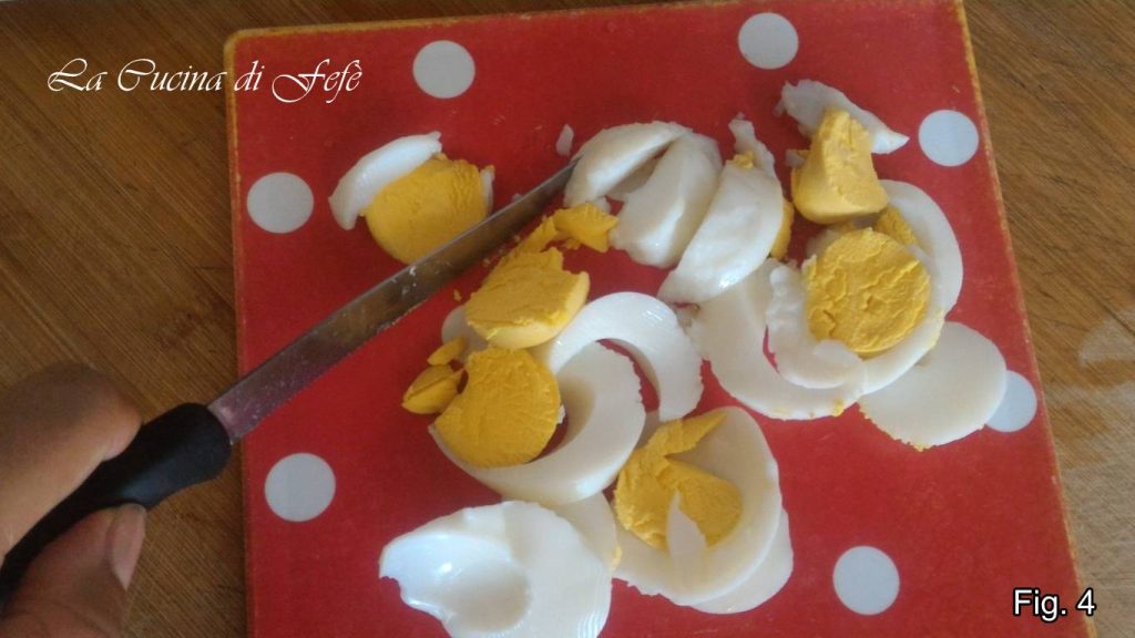 Zodra de eieren hardgekookt zijn, spoel ze af onder koud stromend water, pel ze en snijd ze in stukjes (fig. 4). Maak tenslotte de rucolapesto door de stappen van mijn recept HIER te volgen totdat je een mooie romige en homogene consistentie krijgt (fig. 5).