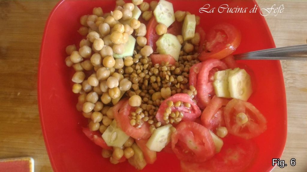 Je bent klaar om je salade samen te stellen: in een grote slakom, voeg de goed uitgelekte peulvruchten, tomaten en komkommers toe (fig. 6). Roer en voeg ook de ijsbergsla, rucola zonder de langste stelen en de in plakjes gesneden eieren toe (fig. 7).