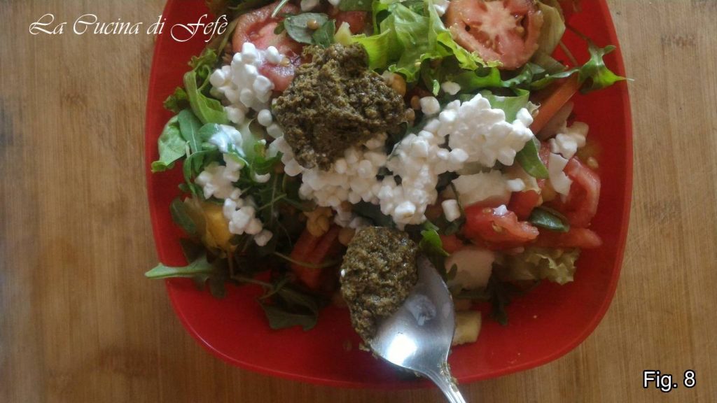 Verfraai met de cottage cheese en een paar lepels pesto (fig. 8). Meng goed, breng op smaak met zout en besprenkel met een flinke scheut olie (fig. 9).