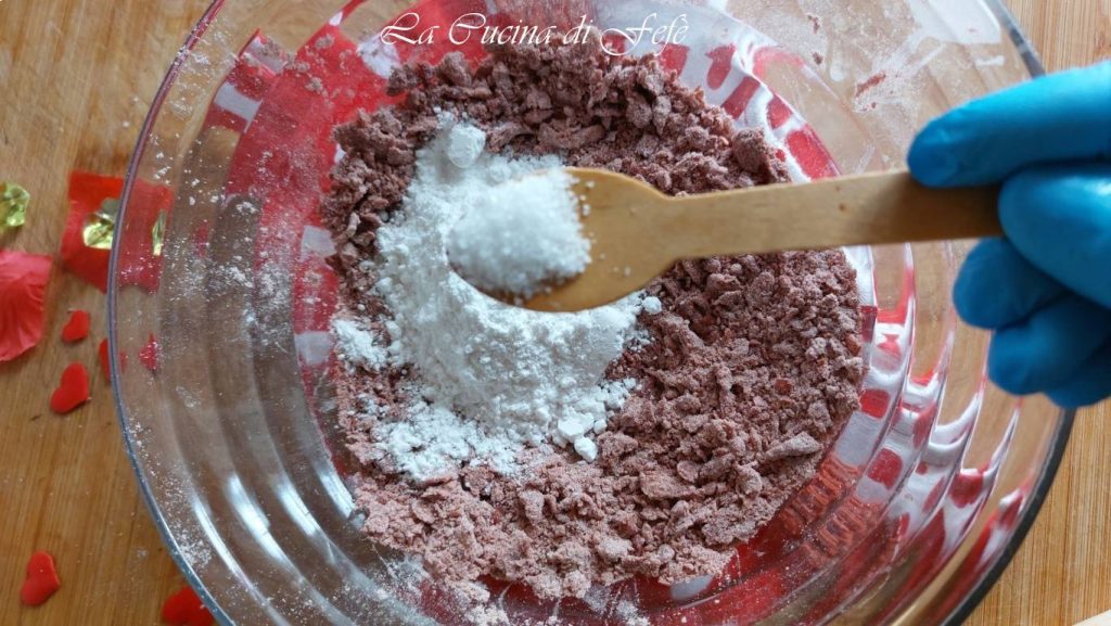 Bereid het glazuur door poedersuiker en eiwit te mengen, vervolgens voeg je ook de rode biet poeder toe en breng je het over in een wegwerpspuitzak.