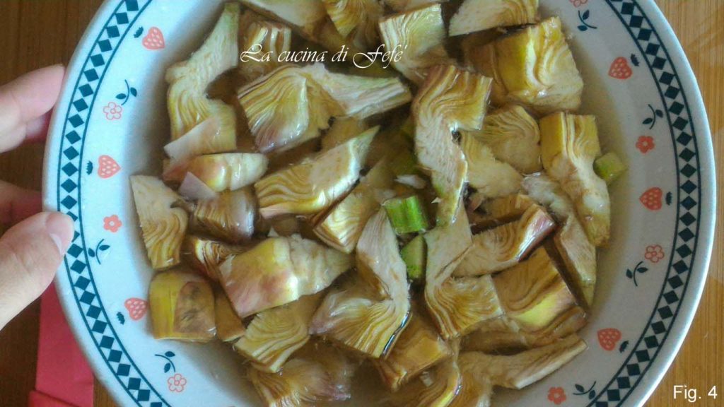 • Doe de verkregen partjes in zuur water met citroensap om te voorkomen dat de artisjokken bij contact met lucht oxideren (fig. 4).