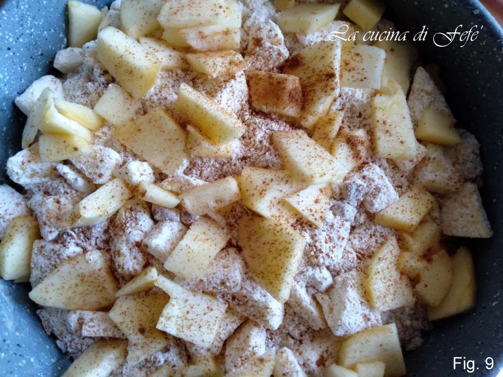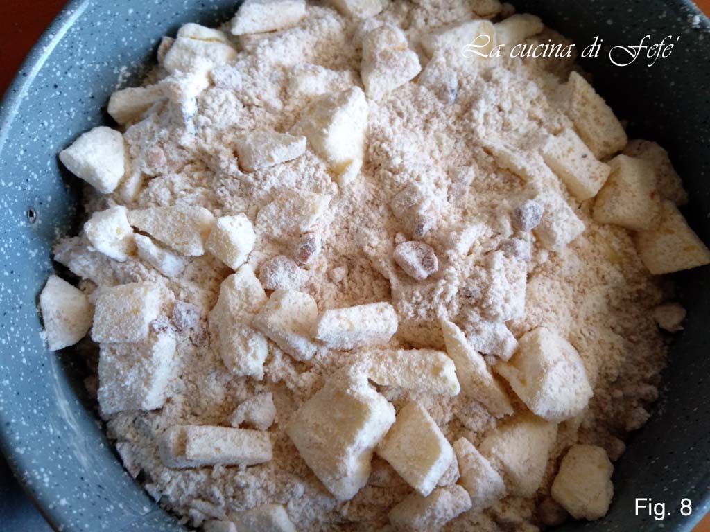 Voor de topping: meng in een kom de bloem met de koude boter in blokjes, de gepelde en verkruimelde kastanjes en de eerder gehakte geroosterde hazelnoten (fig. 7).