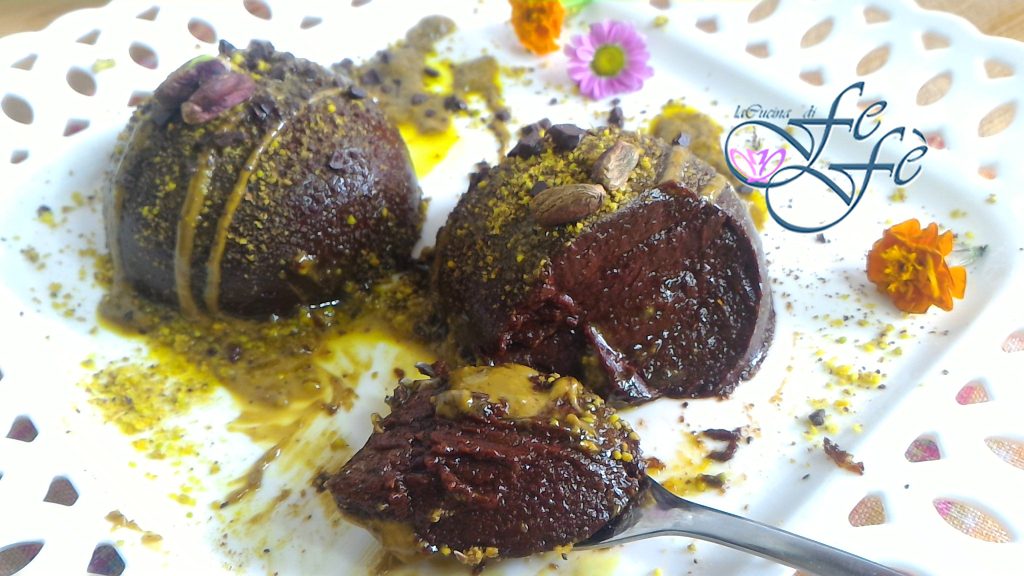 Als ik je vertel dat dit dessert dat ik vandaag aan je aandacht wil brengen slechts twee ingrediënten heeft en veganistisch is, zonder suiker, lactose en gluten? Nee, het is geen droom, het is werkelijkheid! Het is een slim recept dat ook degenen die een streng dieet moeten volgen, een moment van genot zonder schuldgevoelens biedt! De nep-budino wordt namelijk gemaakt met slechts twee ingrediënten, de kaki, een vrucht van dit herfstseizoen, en cacao. Geen zetmeel, geen gelatine, maar alleen de magie van de vrucht zelf, die van nature pectine bevat, waardoor het, eenmaal in de koelkast geplaatst, gemakkelijk kan stollen! Bovendien, omdat kaki’s bij uitstek zoete vruchten zijn, is het niet nodig om extra zoetstoffen toe te voegen. Een groot voordeel, denk je niet? En als we daaraan toevoegen dat deze puddingen ook als verspillingsvrij dessert kunnen worden beschouwd? Ja, want kaki’s rijpen heel gemakkelijk en dit kan een geldige manier zijn om te voorkomen dat ze bederven. Kortom, een dessert met duizend deugden, een gezond tussendoortje voor uw kinderen, een fit dessert voor volwassenen! Ik wilde ze een beetje verleiden door aan de basisingrediënten vanille-extract toe te voegen, absoluut optioneel, en pistachemeel en topping voor een indrukwekkende eindpresentatie. U zou de puddingen in plaats daarvan kunnen serveren met klodders opgeklopte plantaardige room en chocoladeschilfers! Ik ben er zeker van dat je fantasie niet zal ontbreken!