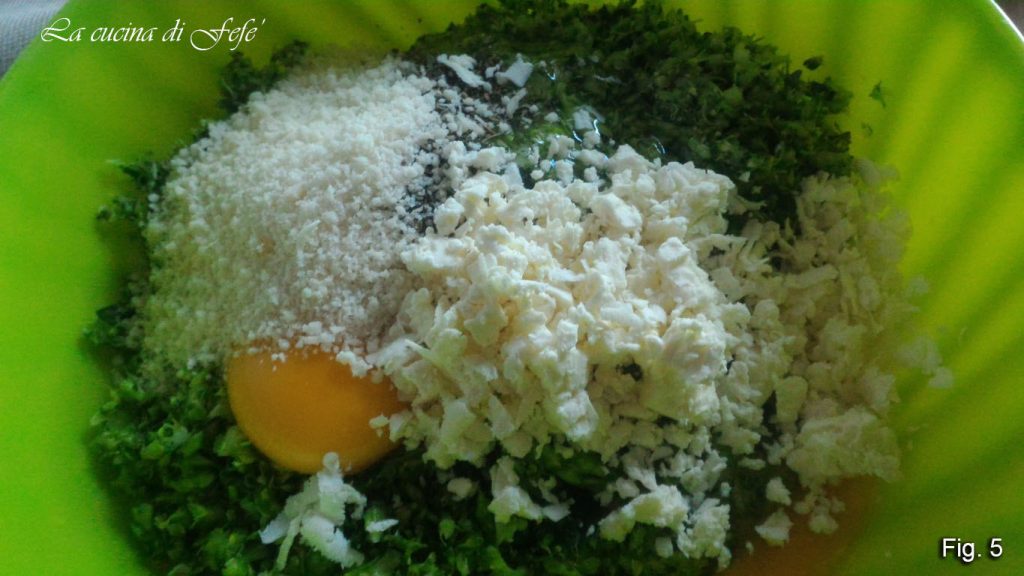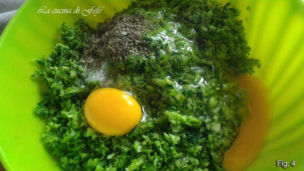 Breng alles over naar een kom, voeg de eieren, een snufje zout en het kruidenmengsel toe.