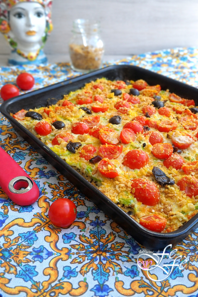 Leg de courgettelinten met de ricotta in een laag ingevette bakvorm en druk ze aan. Voeg vervolgens de gehalveerde cherrytomaatjes, de ontpitte olijven toe en breng op smaak met zout. Bedek het geheel met de resterende geraspte pecorino en het met kurkuma gekruide paneermeel.