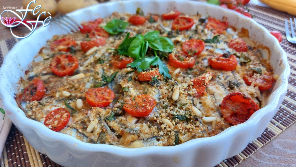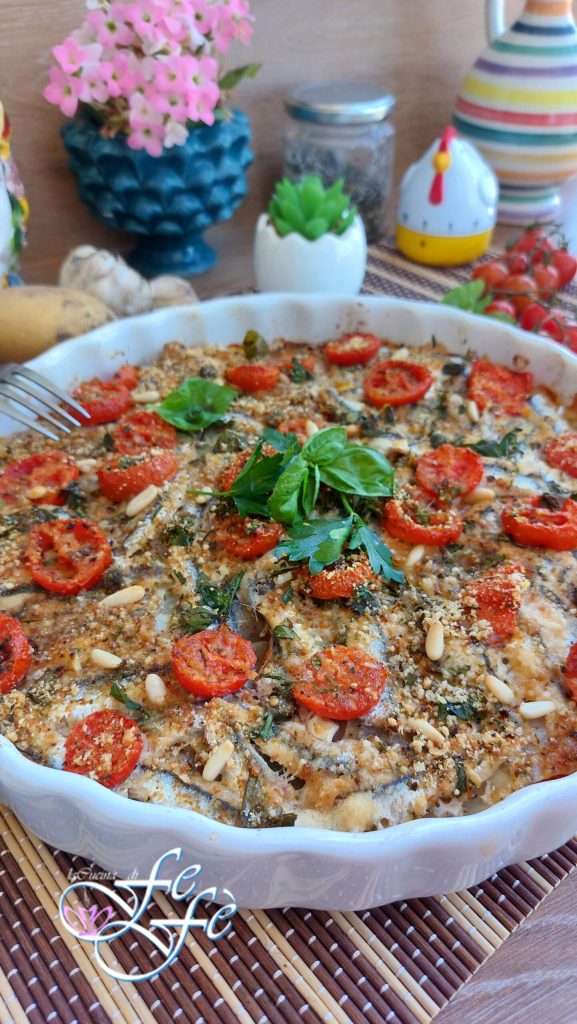 Zoals velen van jullie inmiddels weten, als er een vismaaltijd op het menu staat, is het altijd beter om te kiezen voor hetgeen dat ‘echte blauwe’ wordt genoemd, oftewel de vis die bij uitstek wordt erkend als gezonder en rijk aan heilzame eigenschappen voor het lichaam. Ansjovis bijvoorbeeld behoort tot deze categorie en ik vind ze heerlijk, niet alleen omdat ze gezond en heerlijk zijn, maar ook omdat ze zich lenen voor de bereiding van vele eenvoudige, snelle en zeer smakelijke recepten. Wat ik jullie vandaag voorstel, kan worden beschouwd als een van de meest beproefde van de familie. Toen ik het terugvond op mijn oude blog, kreeg ik meteen zin om het opnieuw te presenteren en zo ook de foto’s te vernieuwen! Als goede Siciliaanse kon ik het bovendien niet nalaten om het te delen, omdat het tot onze culinaire traditie behoort! In Sicilië is de ansjovisschotel echt een must, maar zoals gewoonlijk heb ik het willen herzien om er een persoonlijke versie van te maken, verrijkt met extra smaken en geuren, die van mijn eiland, zoals kappertjes en IGP-kersentomaten uit Pachino. Een intense geur van de zee doordringt mijn keuken dankzij dit zeer authentieke en eenvoudige hoofdgerecht dat hier in de familie altijd zeer gewaardeerd wordt!