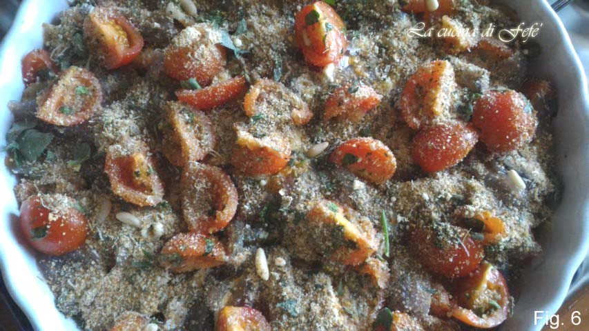 Breng op smaak met zout en besprenkel met een scheutje olie. Was en snijd de kersentomaten in kwarten als ze erg groot zijn of doormidden als ze kleiner zijn, zout ze en breng ze op smaak met olie en oregano. Voeg een deel ervan samen met hun dressing toe bovenop de laag ansjovis, met toevoeging van de helft van de verse lente-ui in plakjes en een handjevol pijnboompitten.