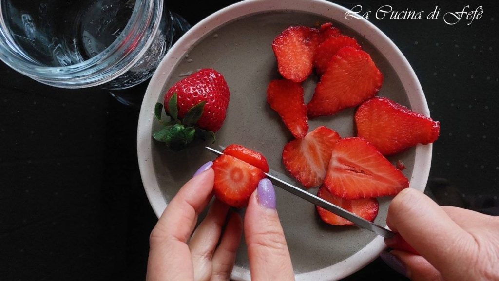 Was vervolgens de aardbeien, droog ze af, verwijder de kroontjes en snijd ze in plakjes van ongeveer 3 mm.