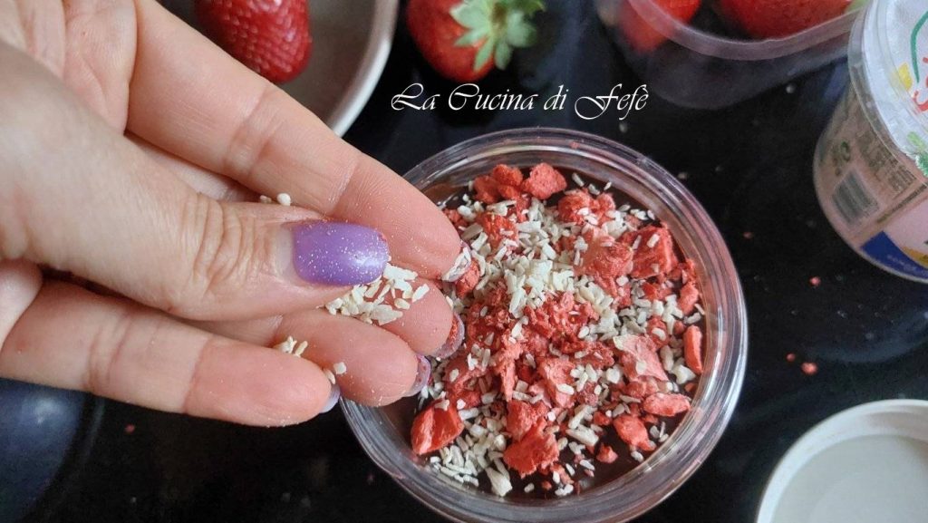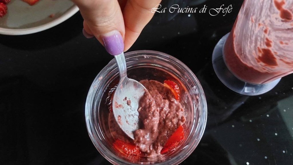De laatste tijd ben ik aan het experimenteren met een heleboel recepten voor een gezond ontbijt en evenwichtig, omdat deze aandacht me heeft geholpen mijn metabolisme te stimuleren! De overnight oatmeal is een van de vele oplossingen die aan deze behoefte voldoet omdat het een sterke verzadigende werking heeft en ervoor zorgt dat je niet hongerig bij de volgende maaltijd aankomt! Zoals eerder uitgelegd, is dit idee van ontbijt typisch voor Engelssprekende landen, het is erg praktisch en snel omdat het geen koken vereist, je hoeft het alleen de avond ervoor klaar te maken zodat je het de volgende ochtend klaar hebt om te genieten! De havervlokken (oatmeal) worden namelijk opgelost in plantaardige melk samen met chiazaad, en vervolgens de hele nacht laten rusten (overnight). Je krijgt een soort pudding, die ik in deze versie heb verrijkt met plakjes verse aardbeien, gebruikmakend van hun seizoensgebondenheid, kokosrasp, yoghurt en cacaocrème. Ik heb een kleurenspel gecreëerd, omdat ook het oog wat wil, en een werkelijk onweerstaanbare textuur! In de ochtend hoef je het alleen te garneren vlak voordat je het proeft met meer verse of gevriesdroogde aardbeien en de lepel erin steken! Ik laat je mijn versie zonder toegevoegde suikers achter omdat voor mijn smaak de natuurlijke zoetheid van de kokos en de aardbeien voldoende is, maar als je wilt, kun je naar smaak zoeten, maar wees spaarzaam. Probeer het en je zult er verliefd op worden!