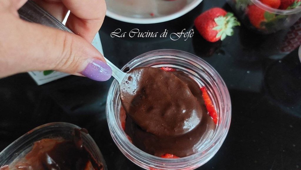 Verdeel het over de twee potten en maak het af met meer plakjes aardbeien, deze keer langs de randen geplaatst met de punt naar beneden als afwisseling met degenen die op de bodem liggen.