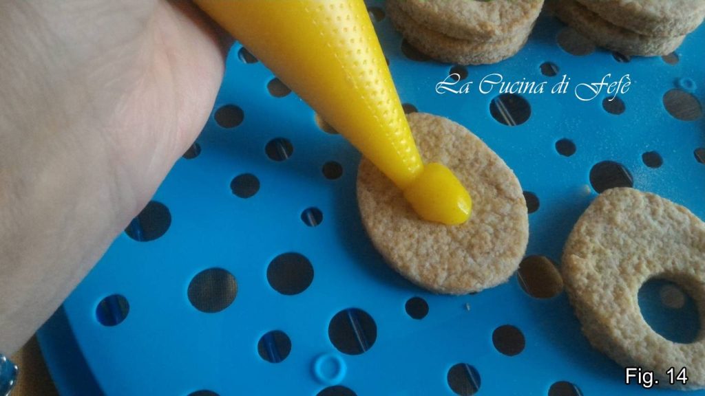 Als ze volledig afgekoeld zijn, breng je de banketbakkersroom aan in het midden van de hele eivormen met behulp van een spuitzak of een theelepel. Leg het bovenste deeg met het gat er heel voorzichtig op zodat ze aan elkaar plakken.