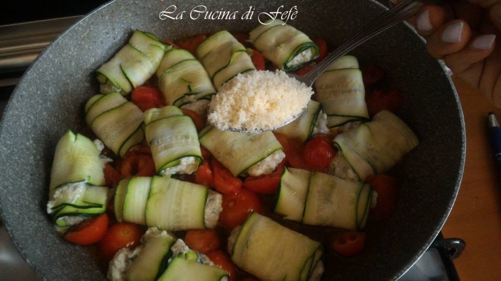 Voeg ook de courgetterolletjes toe aan de tomatensaus, een andere scheut olijfolie, de resterende geraspte Parmezaanse kaas en de oregano. Sluit af met een deksel en laat zachtjes koken voor 20′.