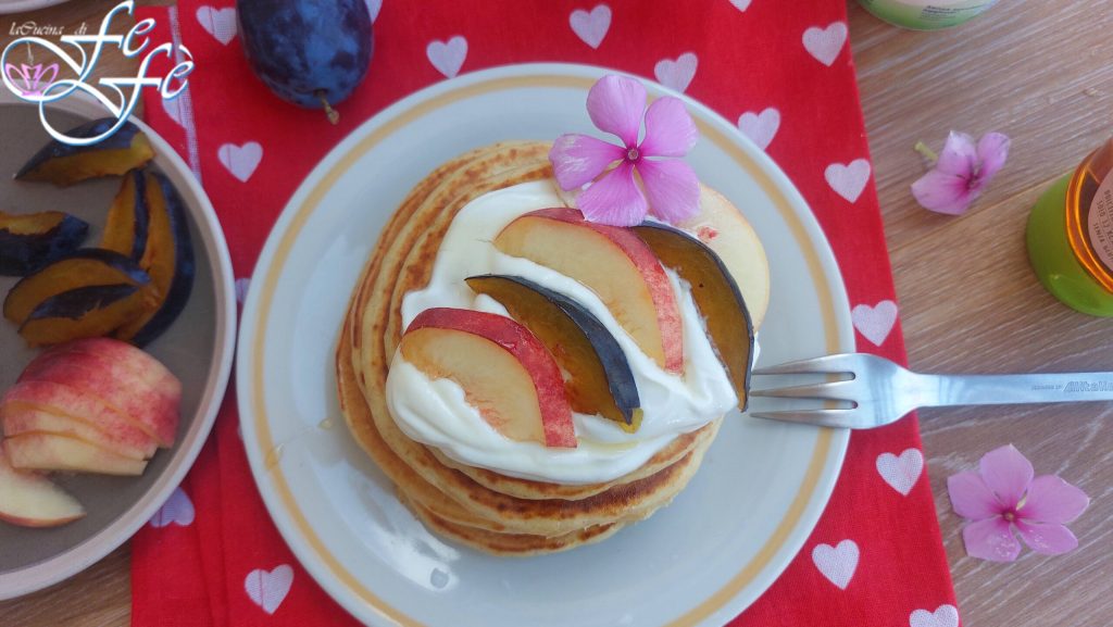 Als er één ding is dat ik in deze jaren sinds het starten van mijn blog graag heb gedaan, is het wel de voortdurende zoektocht naar gezonde recepten, die niet per se dieet zijn, maar licht, smakelijk en geschikt voor het hele gezin! Daarom stel ik u vandaag dit recept voor, dat volledig aan deze kwaliteiten voldoet. Het is namelijk een gezondere en beter verteerbare versie van de traditionele pannenkoeken. Het beslag bevat geen suikers en ook geen vet zoals boter of olie! Ik maakte ze als ontbijt voor mijn verjaardag gisteren om mezelf een andere traktatie te gunnen, en ik moet zeggen dat ze heerlijk luchtig en smakelijk waren! En aangezien deze Amerikaanse pannenkoeken, waar iedereen dol op is, nu ook over de oceaan veel lichter zijn, geef ik hier de hoeveelheden om er minstens het dubbele van te maken, je zult zien dat ze als warme broodjes over de toonbank gaan! Ik serveerde ze met een paar lepels Griekse yoghurt erbovenop, een onweerstaanbare stroom agavesiroop en verse plakjes fruit, profiteer van de perziken en pruimen die afkomstig zijn van de boerderij van een lieve buurvrouw! Natuurlijk kun je ze versieren met wat je maar wilt of wat je in de voorraadkast hebt, zelfs met witte chocoladeschilfers zoals in mijn tweede ochtendversie. Wat kan ik zeggen? Geweldig! Ze zijn ook perfect voor een brunch of een gezonde en smakelijke snack.