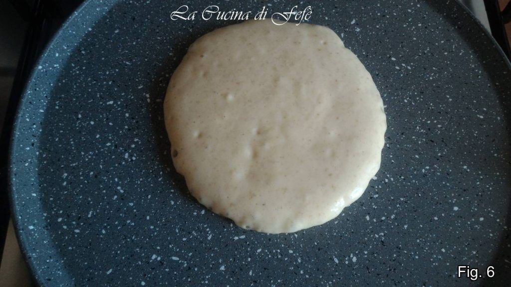 Verwarm een pannenkoekenpan of een anti-aanbakpan en zodra deze goed heet is, giet je er een pollepel pancakebeslag in (fig. 6).