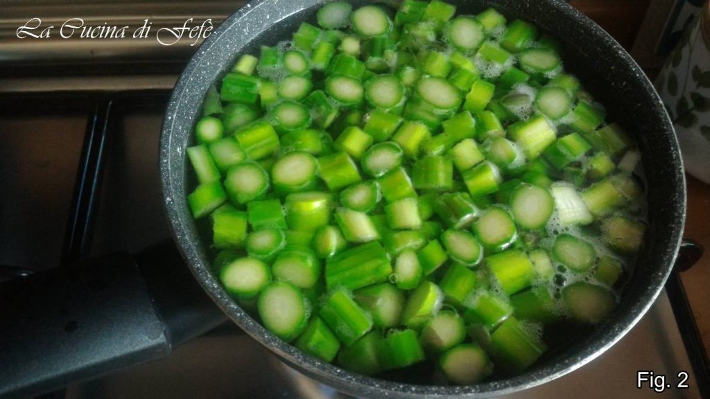 Begin met het plaatsen van de asperges op een snijplank. Verwijder het onderste, wittere en hardere deel, en zorg ervoor dat de asperges gelijk in lengte zijn, zodat ze gelijkmatig kunnen garen. Gebruik vervolgens een dunschiller om de vezelige delen te verwijderen, scheid de toppen van de stelen en snijd deze laatste in plakjes (afbeelding 1).