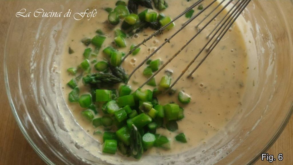 Zodra de asperges zijn uitgelekt, voeg ze toe aan het beslag en meng een laatste keer (afbeelding 6). Vorm geleidelijk je panceci door telkens een paar eetlepels van het mengsel in een goed ingevette en dan met keukenpapier afgeveegde crêpepan of pan met compartimenten te gieten. Dit hoef je maar één keer te doen (afbeelding 7).