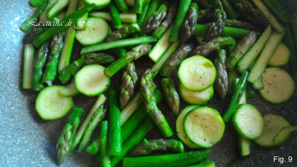 Voeg ook de aspergetoppen toe en nog een beetje water als ze te droog worden, en kook nog eens 2 minuten. Zet het vuur uit, zout en peper.