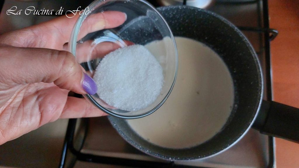 • Giet ondertussen de verse room in een steelpan en voeg de suiker toe.