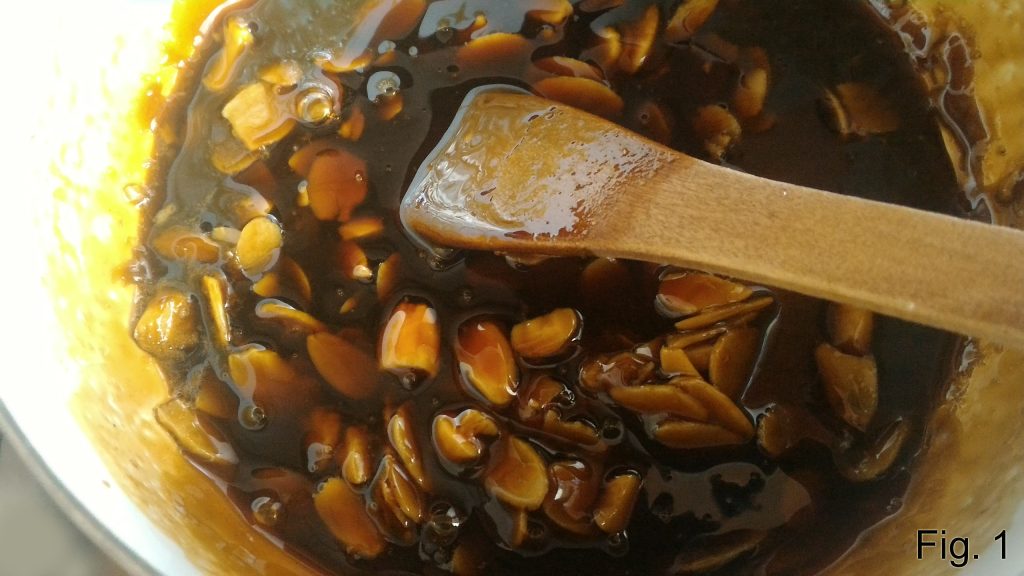 Bereid ondertussen de karamel door de rietsuiker met het water zachtjes in een pannetje te verwarmen totdat er een dikke saus ontstaat met een donkerdere kleur. Voeg daarna de amandelen toe die je van tevoren een paar minuten in een koekenpan geroosterd hebt om hun essentiële oliën vrij te laten komen, en roer goed door.