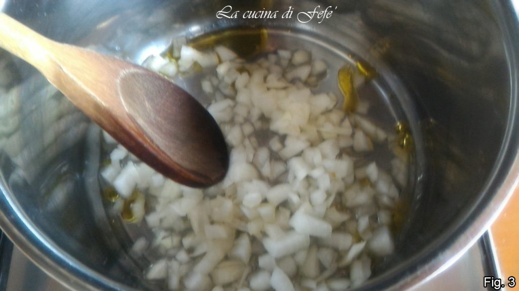 Laat in een steelpan de fijngesneden ui een minuutje fruiten met twee eetlepels olie (fig. 3).