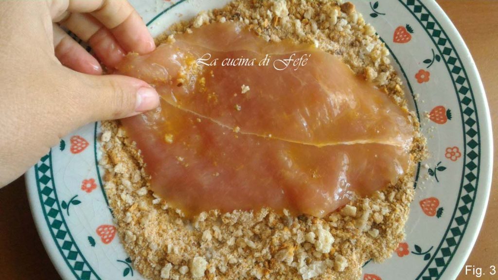 • Bereid in een diepe schaal een mengsel van losgeklopte eieren met een snufje zout en een draai versgemalen peper, en haal de plakjes kalkoen erdoor (fig. 2).
