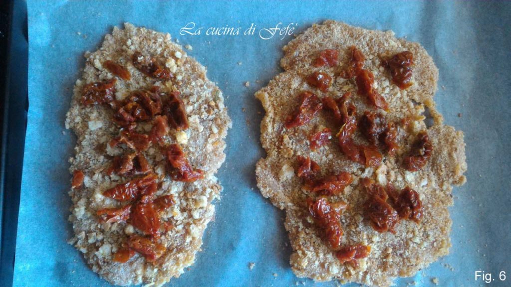 • Na 10 minuten bakken, haal de koteletten uit de oven en garneer de bovenkant met de reepjes gedroogde tomaat (fig. 6).