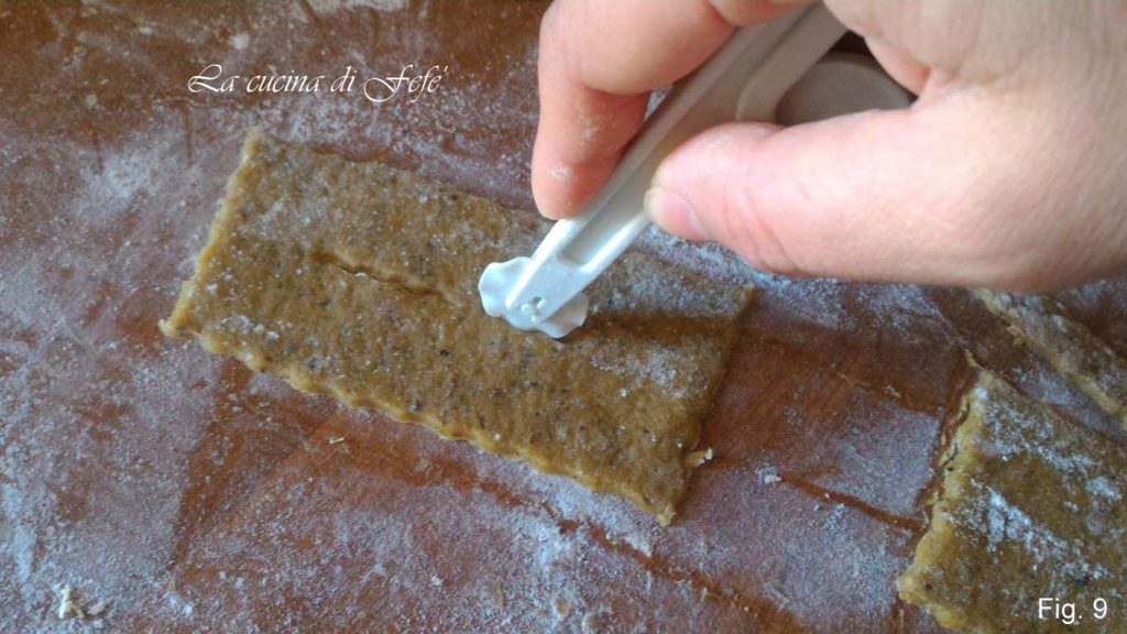 Rol het deeg verder uit met de pastamachine tot het glad en dun is. Om dit te bereiken, moet je het meerdere keren door de machine halen en over zichzelf vouwen, bestrooid met bloem. Vorm vervolgens de chiacchiere door rechthoeken te maken met een kartelwieltje (fig. 8).